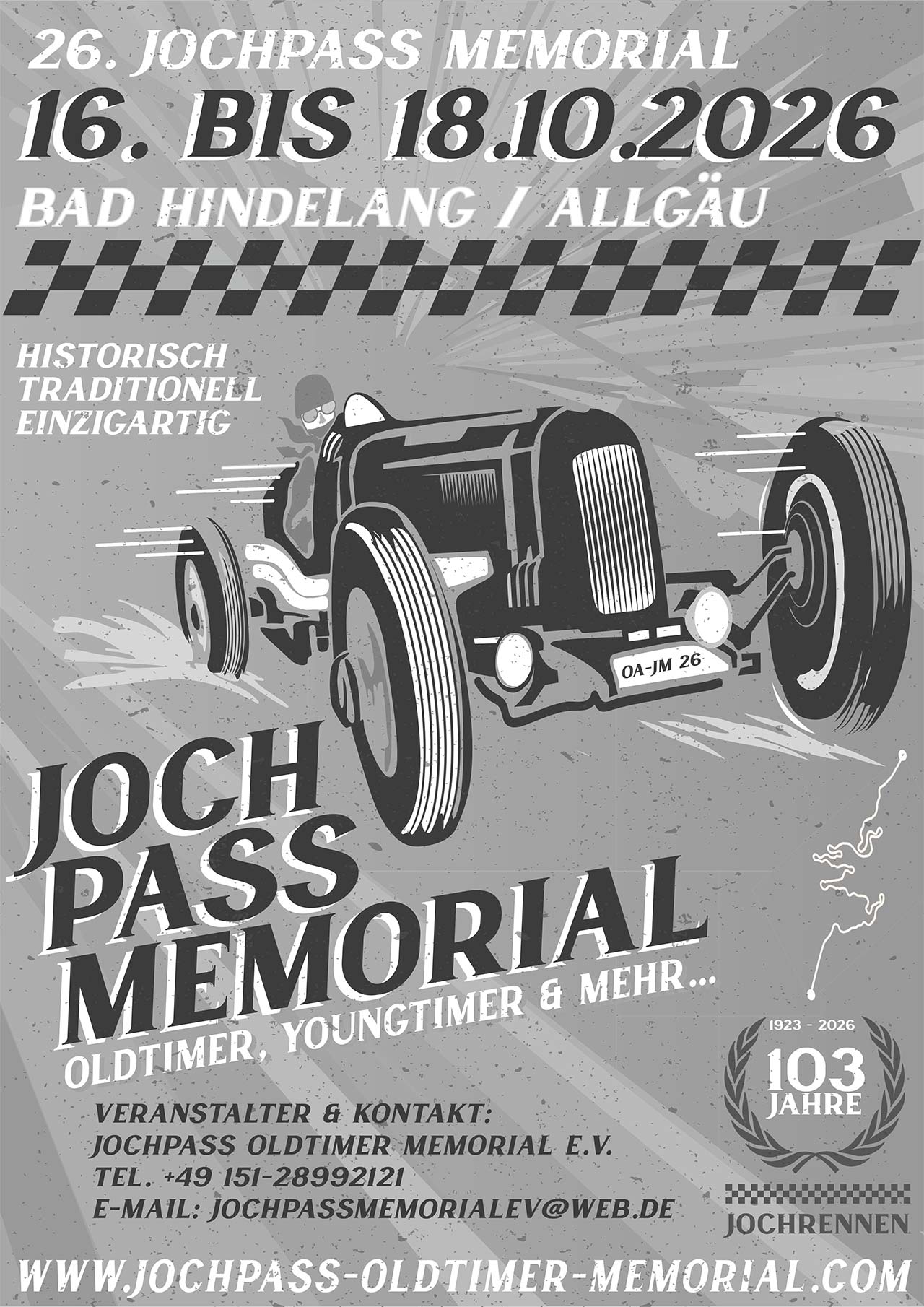 Jochpass Oldtimer Memorial 2025 – Tradition trifft Motorsport-Leidenschaft Vom 17. bis 19. Oktober 2025 wird Bad Hindelang im Allgäu erneut zur Bühne für faszinierende Klassiker: Beim Jochpass Oldtimer Memorial gehen historische Automobile, Motorräder und Vespa-Roller...